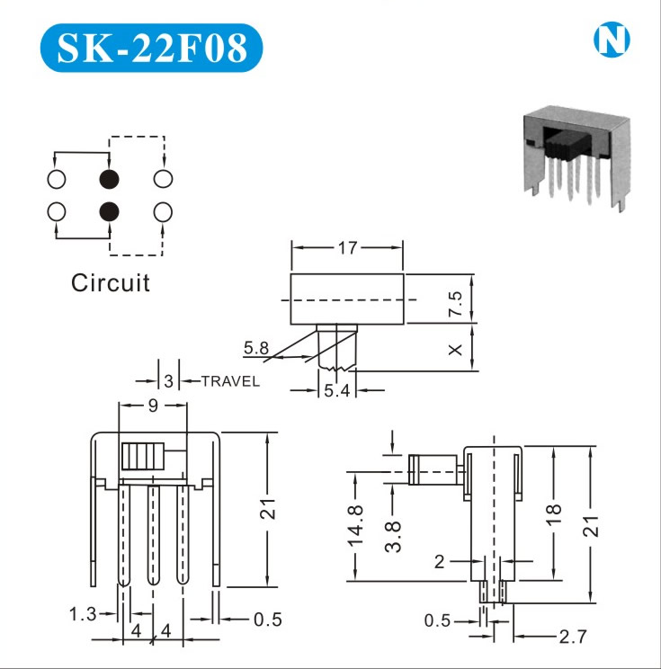 SK-22F08 詳細(xì)資料 產(chǎn)品說(shuō)明: 技術(shù)指標(biāo): 使用溫度范圍 -20~+70℃ 耐壓 AC250V(50Hz)/min 額定負(fù)荷 DC 50V 0.5A 動(dòng)作力 250±100gf 接觸電阻 ≤0.05Ω 機(jī)械壽命 10000次 絕緣電阻 ≥100MΩ