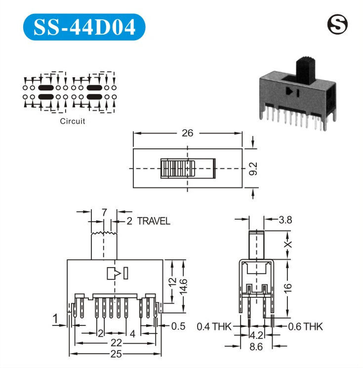 SS-44D04 詳細(xì)資料 產(chǎn)品說明: 技術(shù)指標(biāo): 使用溫度范圍 -20~+70℃ 耐壓 AC250V(50Hz)/min 額定負(fù)荷 DC 50V 0.5A 動(dòng)作力 250±100gf 接觸電阻 ≤0.05Ω 機(jī)械壽命 10000次 絕緣電阻 ≥100MΩ